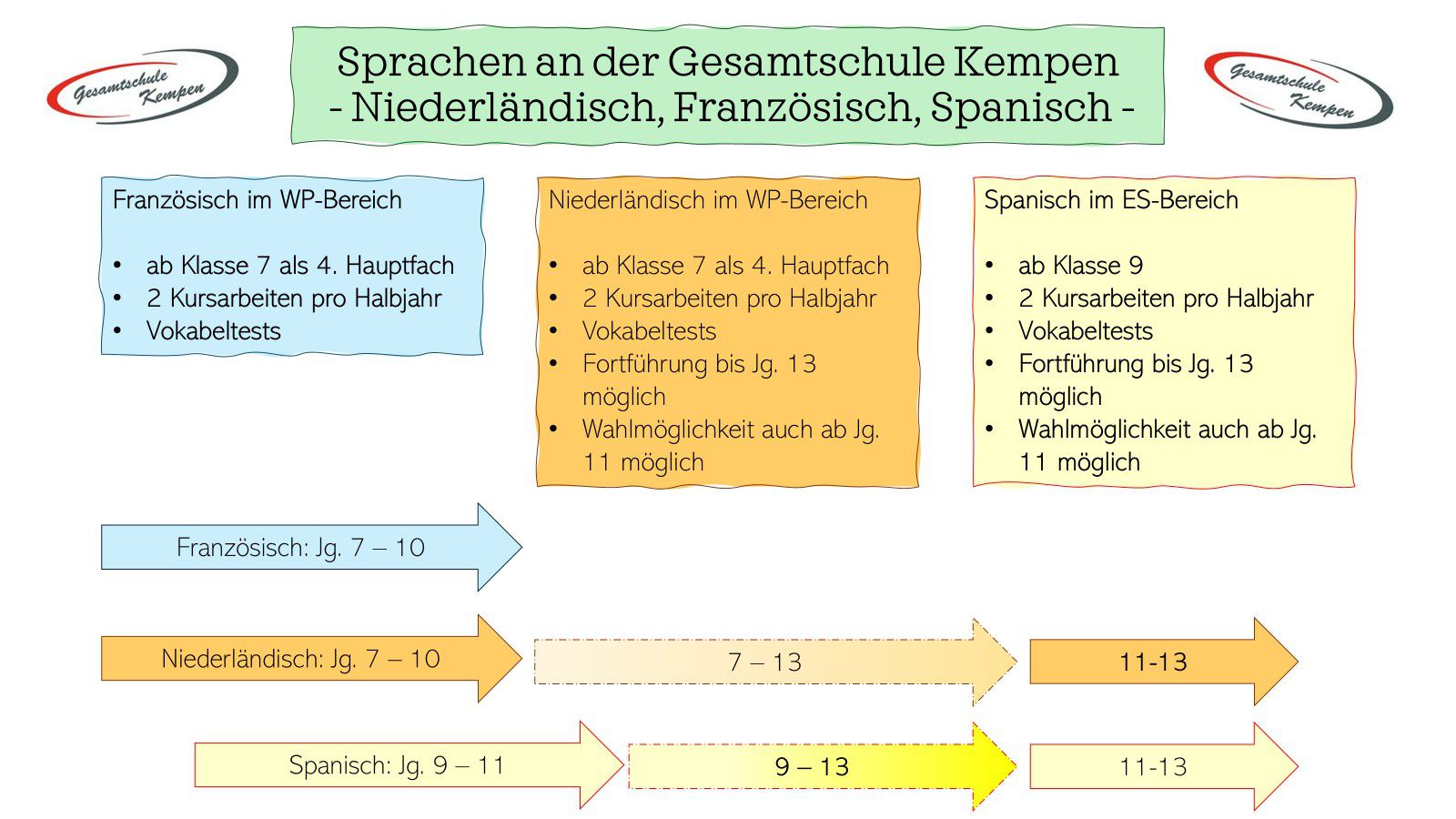 - Sek II: Neueinsetzend wird Spanisch vierstündig, fortgeführt dreistündig unterrichtet.